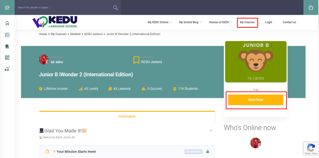 When your students have to use My Courses the first time they have to press ‘Start now to enrol in that course. I suggest showing this on the board and in the first lesson to assign registering as homework.