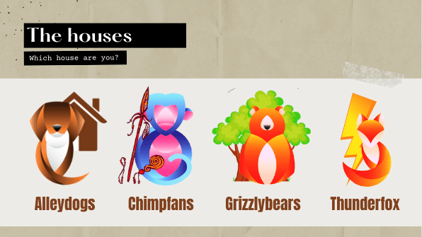 The houses of kedu are four.That are Grizzlybears,Alleydogs,Chimpfans and Thunderfoxes.Children with similar characteristics to animals were selected to be included in these groups. I am in Grizzlybears.The children get points and the team who gets more points is first.The student that gets 1.000 points get a badge.With that we have a good time.