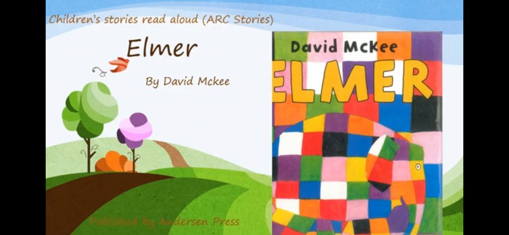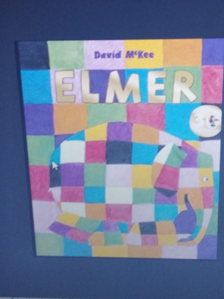 Elmer, the elephant.All elephants had the same colour, but Elmer was different. He was patchwork: yellow, green, black, purple, orange, pink, white and blue.